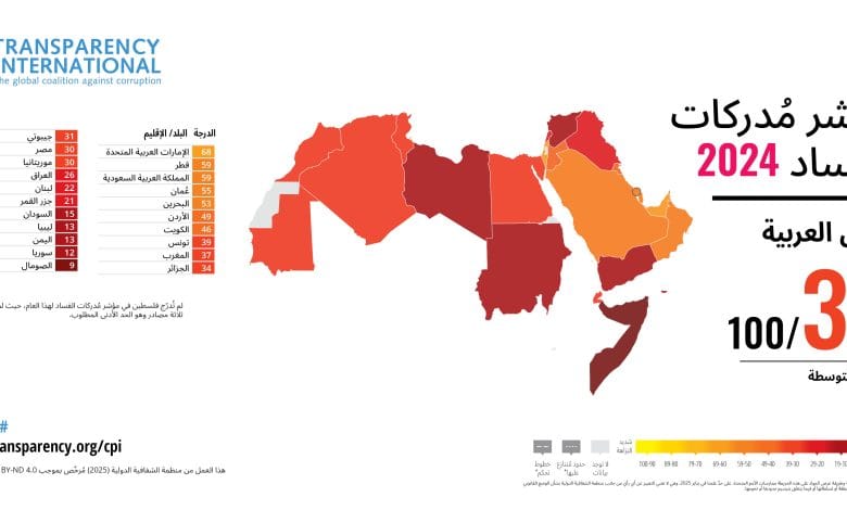 أصدرت منظمة الشفافية الدولية نتائج مؤشر مدركات الفساد (CPI) للعام 2024 لدول العالم، والمتضمن لنتائج الدول العربية، إذ أظهرت نتائج المؤشر أن الفساد لا يزال متجذراً بعمق في العالم، وفي منطقة الشرق الأوسط وشمال أفريقيا، حيث لم تشهد المنطقة تقدمًا يُذكر خلال السنوات الـ 12 الماضية، بالرغم من ارتفاع متوسط درجات المنطقة بنقطة واحدة فقط عن العام الماضي، من 38 إلى 39 من 100، إلا أنه يبقى أقل بكثير من المتوسط العالمي البالغ 43%.