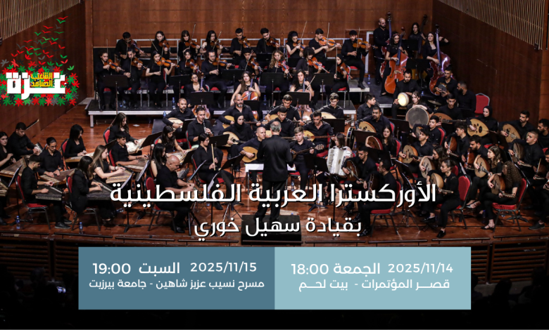 رام الله – بعنوان “غزة الشعب الصامد”، ينظّم معهد إدوارد سعيد الوطني للموسيقى عرضين للأوركسترا العربية الفلسطينية بقيادة الفنان سهيل خوري، أولهما في مسرح قصر المؤتمرات في مدينة بيت لحم يوم الجمعة 14 تشرين الثاني (نوفمبر) 2025، والثاني في مسرح نسيب شاهين جامعة بيرزيت يوم السبت 15 تشرين الثاني (نوفمبر) 2025.