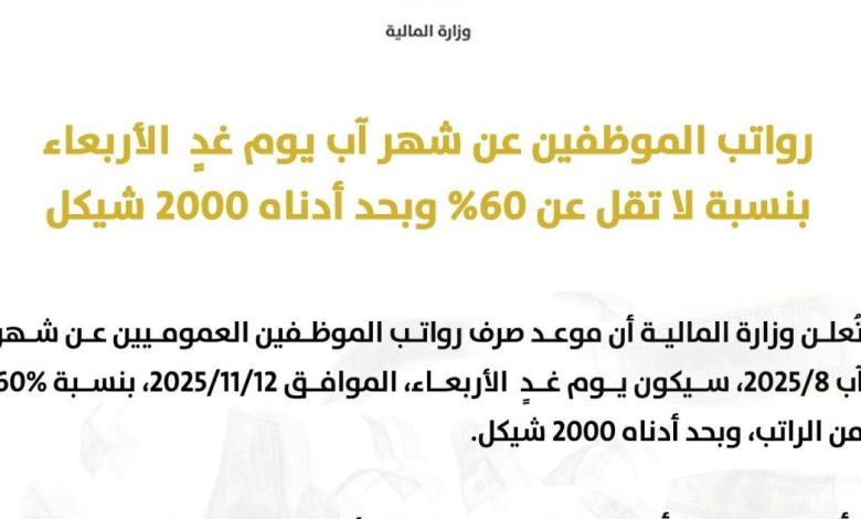 أعلنت وزارة المالية، صرف رواتب الموظفين العموميين عن شهر آب 2025/8، اليوم الأربعاء، بنسبة 60% من الراتب، وبحد أدناه 2000 شيقل.