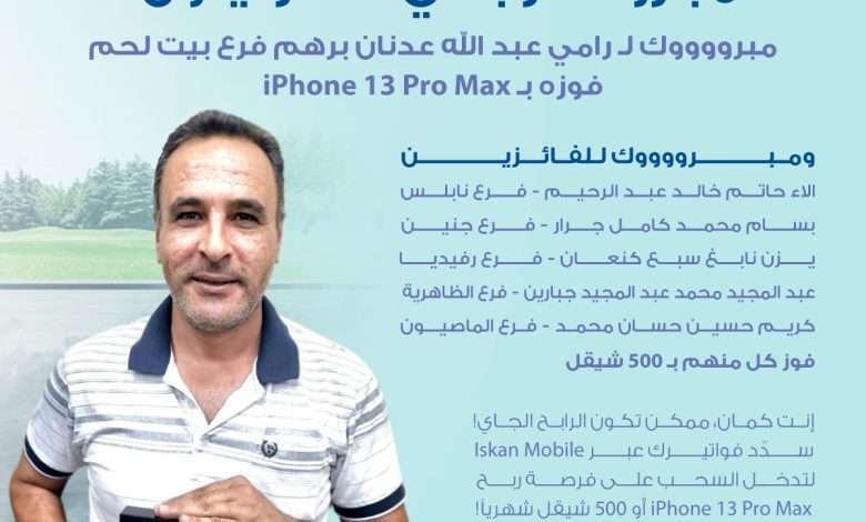 أعلن بنك الإسكان عن أسماء الرابحين في جوائز حملته “كيف ما تدورها انت الكسبان” والمخصصة لخدمة الدفع الإلكتروني من خلال تطبيق إسكان موبايل، حيث فاز السيد رامي عبد الله عدنان برهم من فرع بيت لحم بجائزة الشهر الثالث وهي عبارة عن جهاز IPhone 13 Pro Max، بالإضافة إلى 5 جوائز نقدية قيمة كل منها 500 شيكل فاز بها كل من الاء حاتم خالد عبد الرحيم من فرع نابلس، بسام محمد كامل جرار من فرع جنين، يزن نابغ سبع كنعان من فرع رفيديا، عبد المجيد محمد عبد المجيد جبارين من فرع الظاهرية، كريم حسين حسان محمد من فرع الماصيون.